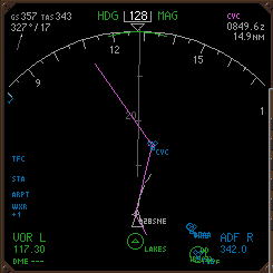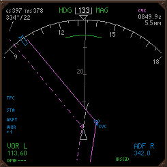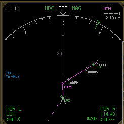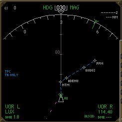 NDにオフセットルートが白色の点 線で表示される.EXECキーが点 灯するのでプッシュしてデータを 確定する. |