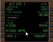 アプローチ・プロシジャーを行なっている際の RTEページの表示.現在ILS34Lアプローチ を行なっている事がわかる.その下には MISSED APPRと表示されており、SDMまで のミストアプローチ・コースが用意されている 事がわかる. |