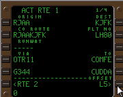 ROUTEラインにカンパニー・ルートを入力すると、自動的に到着空港の4レターコードがLSK1Rに表示される仕組みになっているからだ。このラインへは、飛行中に再入力することが出来る。再入力すると、CDUのDEP/ARRページにセットしていたSTAR、アプローチ・レグ、着陸滑走路のデータが自動的に消去される仕組みになっている。目的地の天候がミニマムを切った時など目的地に行けない場合、このラインへ代替空港の4レターコードを入れる事で代替空港までの飛行を行なう事が出来るようになる。この際のルート設定は、CDUのRTEページもしくはLEGSページによりマニュアル入力しなければいけない。