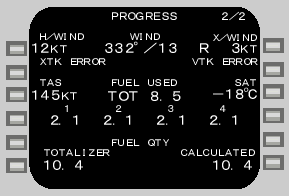 現在の向かい風(H)若しくは追い風(T)の速度成分をLSK 1Lに、風向・風速をLSK 1Cに、横風の速度成分(左側からの横風の場合、速度表示の左側にLが、右側からの横風の場合、Rが表示される)を1Rに表示する。このデータはIRSから得られるものなので、地上では使用できない(地上ではブランクになる)。