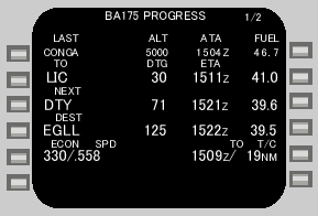 到着空港の4レターコード、DTG、ETA、予想残燃料が表示される。このラインに、パイロットがマニュアルでエンルート上のwptやエンルート上にないwptや代替目的地の名称を入力すると、その任意の地点までのDTG、その地点に到達すると予測されるETA、予想残燃料がライン上に表示される。この際、エンルート上のwptを入力すると、ラインタイトルが『DEST』から『ENROUTE WPT』に変わる。又エンルート上にないwptを入力すると、『DEST』から『DIR TO ALTERNATE』(ダイレクト・トゥ・オルターネート)に変わる。この際の目的地までの距離、予想到達時刻、予想残燃料は、現在地から目的地まで現在の速度、高度、燃料消費量で直行した場合を仮定して計算されるので注意が必要。これらのパイロットの入力はあくまでも参考の為であってデータを書きかえる事は出来ない。『DEL』キーをプッシュしてLSK4Lに入力したデータを削除するか、若しくは他のページにアクセスすると、4Lのデータは元のDESTラインに戻る。