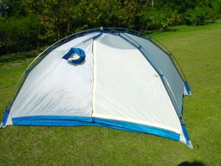 登山用品にも,新素材や機能性素材が使われている.テントの素材も,軽量で,強度があり,耐候性に優れた材料が使われるようになっている.下の写真のテントは,1年を通して使える登山用テントの代表的な製品である.このテントは,1人でやっても,設営に1-2分しかかからない.