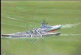 戦線を離脱するビスマルク。 ニュージャージー艦長 「うぬ。逃げるとは武士道の風上におけぬわ。いや、アメリカ風に言うならならユー アーチキン。ってか」