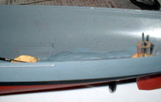 船体の外側のスクリューが通る部分にもパテで盛っておきます。 それから塗装します。 艦底のハルレッドはスプレー缶1本で足りない場合があります。 複数用意した方がいいでしょう。