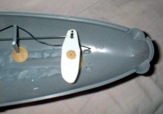 中央の舵のシャフトが通る穴は シャフトよりやや小さめの大きさにしておきシャフトを押し込んで緩まない状態にします。その上からさらにパテで固定します。