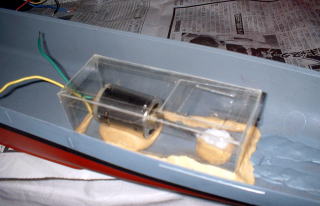 舵同様にロッドでスイッチをコントロールするかどうか考えたのですが、スペースの節約とシンプルにするため 直接サーボに両面テープでスイッチを取り付ける方法にしました。