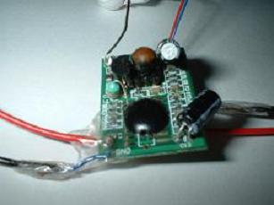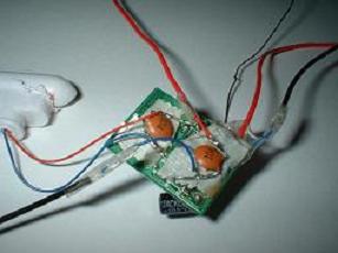 セラミックコンデンサが2個ついており、足からリード線が伸びています 左右モーターのキラーノイズ用みたいです。ちなみに40MHzの基板にはセラミックコンデンサはついていませんでした。