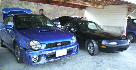 12月9日(土)に、仕事仲間の先輩と、四国にある阿讃サーキットに行ってきました。 初めての超遠距離ドライブになりました。 金曜日の夜に会社から家に帰り、少し一服してから、四国へ向かって徹夜ドライブ・・・。 夜中の1時に家を出て、4時頃に明石大橋を渡り、サーキットに着いたのは、朝の8時前。 片道の交通費だけで1万5千円以上(T-T)。 サーキット開催は、朝の8時だったので、眠い目をこすりながら、走行準備にはいる・・・。 ヘッドライトなどに、ビニールテープをペケの字に張ったり、ゼッケン貰って張ったり、タイム計測機をつけたり。 サーキット走行会は、初めてだったんで、色々先輩に教えてもらい。なんとか時間内に準備完了。 で、いざMYロードスターでサーキット走行♪ うひゃ〜、皆速ぇ〜! 自分の遅さに・・・しくしく・・・。 よく見ると、半分以上の人がSタイヤ履いてる。 サーキットベテランの先輩、走る度にベストラップを更新しており、羨ましいかぎり。 更に最近、MR2から新型インプレッサに乗り換えたので、さらに速さに磨きがかった模様。 などと、サーキット走行を楽しんでたら、ハプニング発生。 先輩のインプが、低速コーナーでアンダーでガードレールに激突。 運良く、ラジエーターは、無傷だったんで、自走可能。不幸中の幸い。 て、感じの一日でした〜。 |