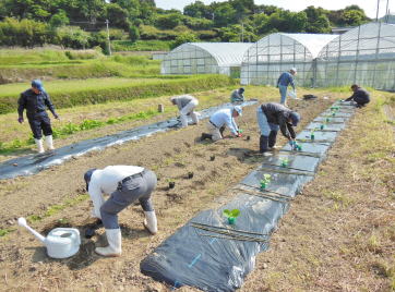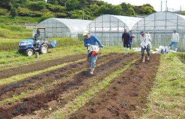 5月9日 サツマイモ 坂井さんと深津さんは1番梅畑と2番梅畑の消毒に行ってくれました。残りのメンバーは先週E畑で準備した畝を少しかさ上げしてサツマイモ(ベニハルカ)の苗を5畝に計150本余りを植えました。 |
