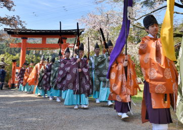 花盛祭は明治時代に始まった春の訪れを祝う祭りで午前中に祭典、お祓い、神楽舞などが本殿の中で執り行われ、昼食後に渡御が始まります。渡御は鎌倉時代から続いていて一時中断し、再開時から花盛祭の午後から行うようになったそうです。