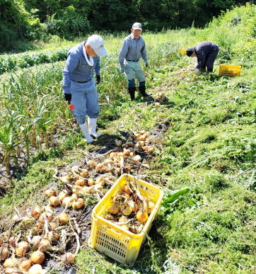 5月6日は休んで今日都合のつく人たちでE畑の作業をしました。先ず全体の草刈りをしてからニンニク畝とタマネギ畝に覆いかぶさっていた草を作物に注意しながら、抜きました。そして下に隠れていたタマネギを収穫しました。今年は型の良いタマネギをコンテナ9杯分収穫出来ました。