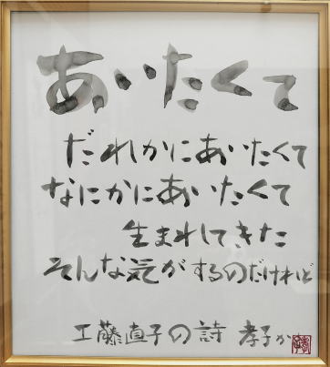 印南町公民館ロビーで印南町文化協会、書道クラブ「清風会」の作品展が21日から26日まで開催されています。大御所の清水正宜先生をはじめ計19名の会員の46作品が展示されています。農園メンバーの辻井さんの奥様が3点、深津さんの奥様が2点出展されていました。この作品は詩人、工藤直子の詩を墨の濃淡で味わい深く書かれています。もう1点は百人一首から紫式部の言葉を行書で書かれていました。