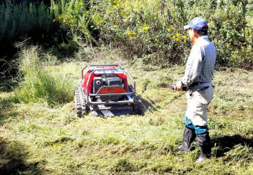 E畑でニンニク、タマネギを植える準備の畝づくりをしました。先週そのための草刈りを全体の半分だけして置きました。耕耘、施肥、畝立てをしてマルチを張りました。残りの半分は「いなはら友遊」のラジコン草刈り機を借りてきて刈りました。 |