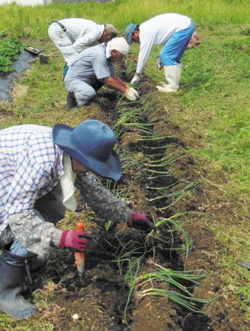タマネギ畝の株元の草を手抜きしている様子です。この後全体の草刈をしました。タマネギは順調に育っています。極早生品種のタマネギが収穫間近なので希望者は数個づつ収穫して持って帰りました。 |