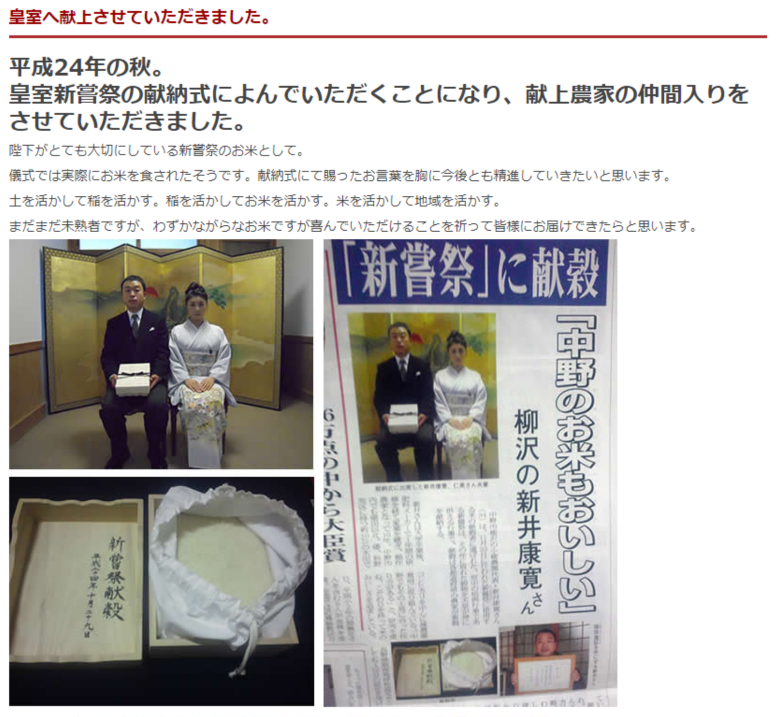 平成24年皇室新嘗祭献上農家 新井さんが丹精込め丁寧に育てた美味しいお米です。特別栽培で育てたコシヒカリは。やさしい甘さと程よい粘りは冷めてもおいしくおにぎりやお弁当との相性も最高です。