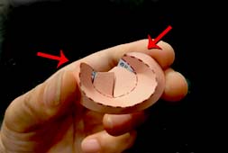 ![]() 矢印のところに接着剤をつける 裏から見たところ | 「目」ののりしろに接着剤をつけ、裏 から貼ります。 目の玉の位置を合わせながら貼り ましょう。 |
