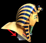 ![]() 横から見たところ | 「えり」のうらに「支え台」ののりしろを貼ります。 「背中」は、まだ貼りません。 |