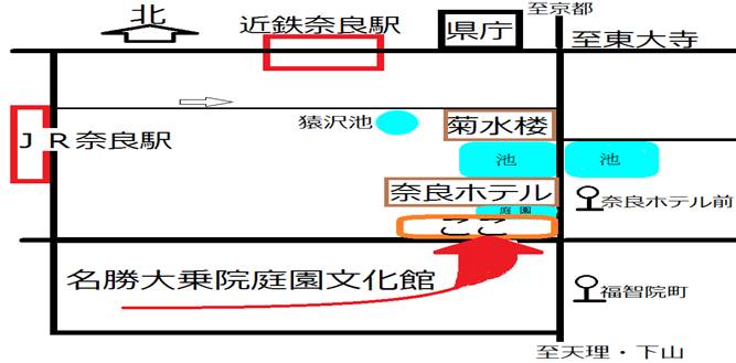 「JR奈良駅東口のりば1番」又は「近鉄奈良駅のりば3番」から奈良交通バス「天理駅}行又は「下山」行に乗車(JR奈良駅から12分、近鉄奈良駅から5分)「奈良ホテル前」下車南へ100m又は次のバス停「福智院町」下車北へ150m。(駐車場はありません。