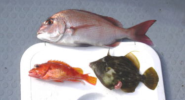 天秤仕掛けで30mの棚で真鯛が1匹釣れました。 教授は釣れない時のまじないのアルコールを1本開けます ガシラさんです、 ASMさんはがんばって色々な仕掛けを使っているのですが〜 ハゲが1匹だけです、 風が強くなって来ます 湾の方に帰りましょう、 獅子が島の横で釣りますがまともな魚は釣れません。 もうすぐ2時になりそうです 片付けて帰りましょうか