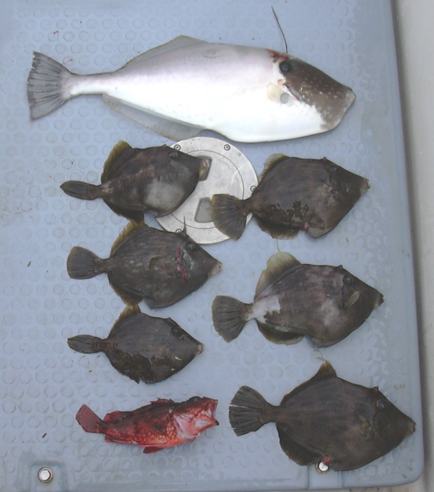 風が吹いているな〜 さあ釣の開始です。 胴付仕掛けでは20号の錘が流されます。30号で落ち着きました。天秤仕掛けもラインが斜めになります。(潮が早い) 天秤仕掛けを降ろしていくとラインが出ません アリャ〜 しかたなくラインを巻くとシイラがジャンプしました 喰っていたのか ペンペンシイラです すぐに上げます。胴付ではエサが取られます、 そのうちにカワハギが釣れました。 これはいいぞ がんばってカワハギを釣りましょう。 ですが〜数が出ません。 場所を変えようとメンバーが言いますので アンカーを上げて少し北の方に向かいます。 が メンバーの一人が知らんポイントはいやだ 釣れる所へ行けと申します。 どこがつれるか分かい
