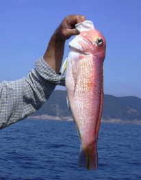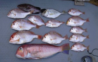 今日のポイントは80メートル付近の予定です。マブリカ沖まででます、 この辺でいいでしょう ボートを止めます、 ではメンバーが 1投目 入れました 80メートル糸が出て行きます 底に着きました、 当たりです 上がってきたのはチダイです 30cm弱でした オイオイ何をするねんや そのあとは小さいながらもチダイが釣れます。