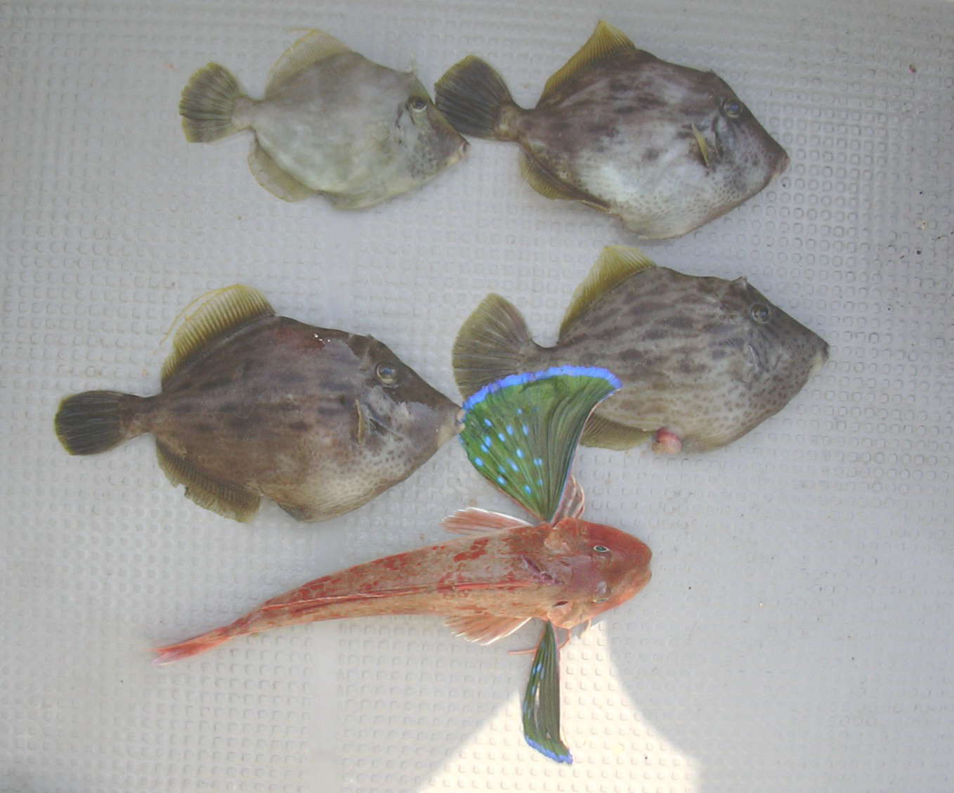 キス仕掛けで釣ったハゲ、胴つきのホウボウ