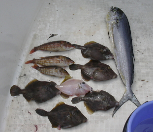 やっと釣れました キタマクラでした。 教授はキタマクラをバケツ1杯釣ってます。 きょうは海の掃除になりそうです。 棚釣では痩せたサバです。(持って帰ってもまずそう)海にお帰り願ってます。