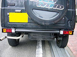 | 純正Rバンパーと交換するRバンパーです。 塗装が乾くまでRバンパーの比較をしましょう。 本体、テールランプの大きさが違うのが分かります。 |