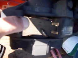 ローターを挟んでいるパッドの状態です。 パッドの厚さが無いのが分かります。 |