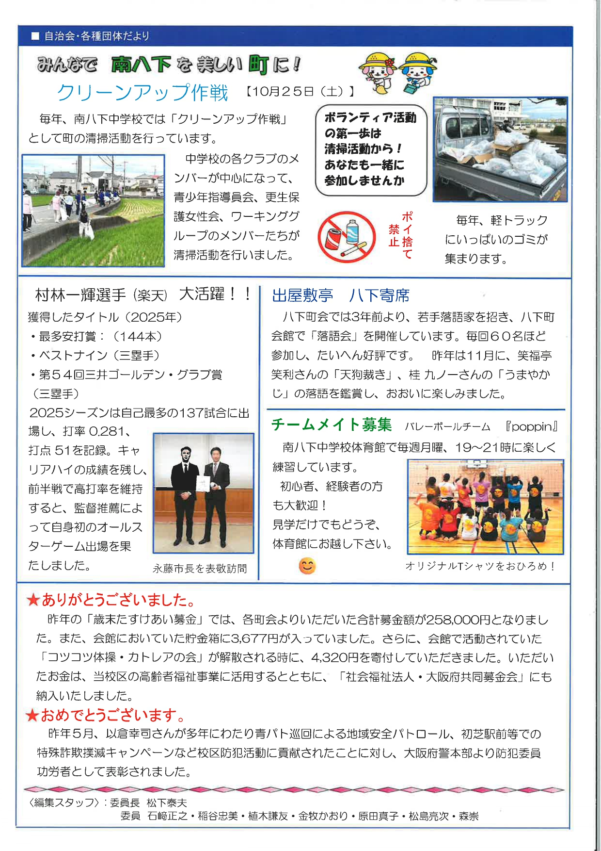自治連合会では年に3~5回程度、南八下コミュニティ新聞を発行しています。 バックナンバーをご覧になりたい方は自治連合会事務局までお問い合わせください(午前中、TEL 072-287-2826)。 編集 校区自治連合会広報企画委員会 発行 南八下自治連合会・南八下福祉委員会 発行責任者 自治連合会長 山本 淳一 第86号(2026年2月発行) ※文字が読みづらい場合は画像をダウンロードし、拡大してご覧ください。