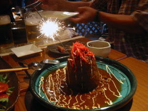 | このお店の風変わりなメニュー「ゴジラの卵」。タケノコのような姿は焼き飯を固めたものです。この焼き飯を崩すと、中にゆで卵が入っているのです。光っているのは花火です。ゴジラが火を噴いている姿を模しているのでしょうか。火が消えた後、針金を持って抜こうとして火傷しました。 | 山登りの疲れも杯を重ねるに連れアルコールで麻痺していき、どこにエネルギーが隠れていたのかと思うくらいの盛り上がりになりました。 かくして20:30、初秋の六甲山ハイキングはいつものとおりの飲み会で幕を閉じたのでした。 皆さん、お疲れでした。 |