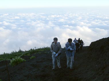 ![]() 登り始めると次第に日が暮れてきます。後方は広大な雲海ですが、雲が明るいので逆光になって人物を写すと暗くなります。 この時間に、降りてくる人たちとすれ違いますが、彼らは朝から登って降りてきたようです。でも日中登るのは暑いだろうなぁ。 |