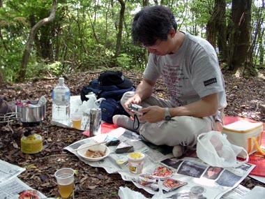 さて、いきなり昼食の図。 長峰山は弁当を広げてくつろげる広場がありません。 山頂からだらだらと西へ下る途中に、やや広い平らな空地があったので、さっそく持参の弁当を広げました。 おなじみのビール、カップ麺、缶詰を出してさながら小宴会。 汗をかいたあとはビールと汁気のあるラーメンが最高っす。 |