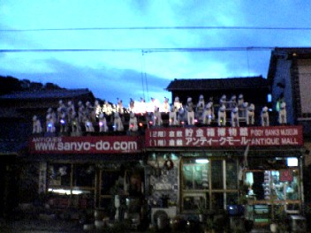 よくレコード屋さんの前に置いてある犬の置物です。それが屋根の上に一杯