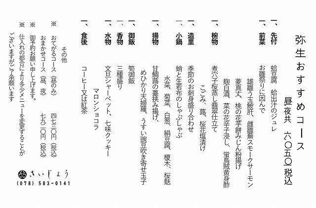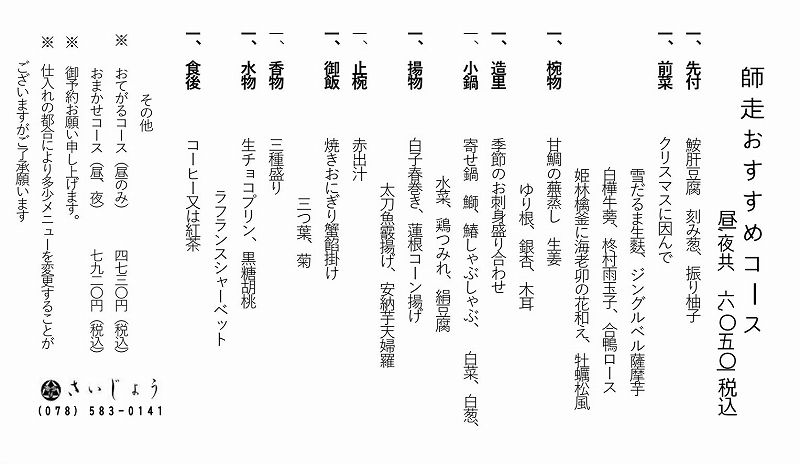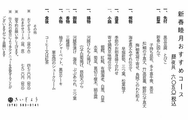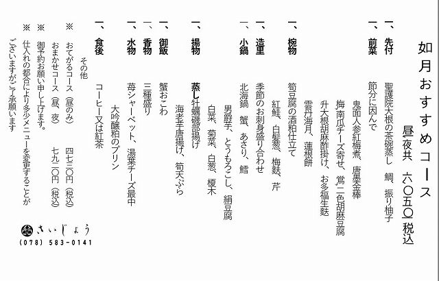 | 厳選した旬の素材を使い、落ち着いた店内でゆっくりと味わっていただけます。 2025年、さいじょうは35周年を迎えました。感謝の気持ちで更に精進してまいります。 どうぞ宜しくお願いいたします。 |