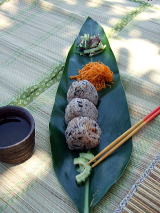 木陰にござをしいて、お姉さんが作ってくれた、名物じゅーしーおにぎりや