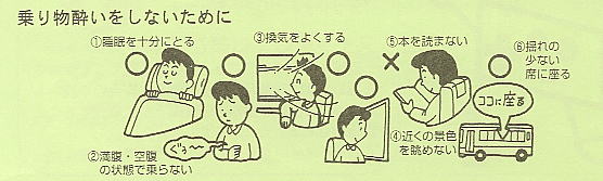 | 症状 乗り物酔いは現代病の一つで、加速度病や動揺病とも呼ばれています。いろいろな乗り物で加速度を伴った動揺を受けると、これが耳の奥のほうにある三半規管という所を強く刺激します。そうすると神経が過敏になって吐き気やむかつき、嘔吐、めまい、頭痛、動悸、冷汗などの不快症状が引き起こります。 乗り物酔いの典型的な症状である嘔吐は、乗り物の揺れで前庭器官が刺激を受けたことにより、胃の幽門が閉じて収縮し、逆に胃の噴門は開き、横隔膜と腹筋が強く収縮して、腹圧が高くなることで胃の内容物が逆戻りして吐き出されます。 |