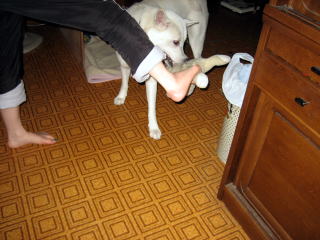 | サンちゃん、今アレルギーがきつくて 目の周りや口の周りが赤くなって かゆくて かゆくて・・・かき過ぎて目の周りから血が出てきてしまいました。。。薬を塗ってあげようとしたら 恐がりサンタ 「ウゥ〜!!」とか言って歯をむいて怒っています。。。で、お母さんが「薬塗るだけでしょ!! 誰!文句言ってるの!!」と叱られています。「サンちゃんのためにやってるのに 文句ばっかり言って!!」??薬塗り終わったらサンちゃんあっち向いて すねてしまいました。。。「サンちゃん」呼んでも知らん顔です。。。困った子です。。。 |