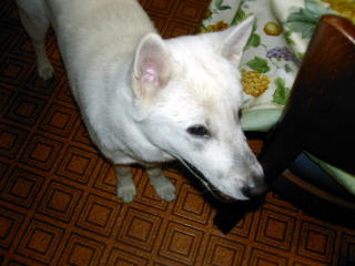 最近は夏バテなのか食欲がありません。とっても心配なので父がお肉の赤身をサンタ用に買ってきました。(ひょっとして一番甘いかも・・・)お肉を見たとたん、食いしん坊サンタ復活で、写真を構えている間に