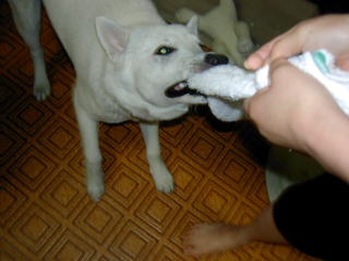拭いてる手を噛みに来る、拭いてる後姿に襲いかかって来る。。。違う雑巾を与えても、母の使っている雑巾を取りに来ます。一度取られた雑巾を取り戻すには、鼻をつまんで息を吸う一瞬に取り返すしかありません。お天気の日は外にほり出せるけど、雨の日の戦いはまだまだ続きます。。。。 |