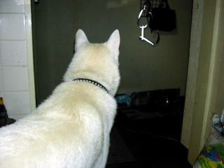 | 父と母が旅行に行って、留守番させられてからサンタは母の行動をよく見ていて、まるで見張っているかのようです。朝のこの時間は「あっ!お母さんと一緒に会社に行く時間だ!」とか「お母さんが何処かに出かける〜!」とか母が何か支度をするたびに写真のように見ています。特にいつもと違う行動をすると「また、留守番させられる〜!」って感じで、いつも以上に引っ付いてきます。チョッと甘えたさんにしてしまいました(反省・・・)でも、サンタに行動を把握されてるなんて、いかに母の毎日が単純なのか・・・・これも又(反省・・・?) |