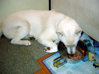 | サンタを甘やかせ過ぎてしまい、ドッグフードをあまり食べなくなりました・・・ふて腐れたままイヤイヤ食べるサンタを見かねて、ついつい手で食べさせてしまいました。。。。それでも最近は食べなくなってしまい、サンタの朝ごはんは皆と同じ食パンで、晩ご飯は猫マンマ(ご飯に鰹節をかけたもの)になってしまいました。それでも時々ドックフードを食べると「サンちゃん偉いね〜。」なんてみんなでほめてしまっています。(当たり前の事なのに・・・・)母が甘やかせてしまうから!!と攻められています。これは大いに反省してます。 |