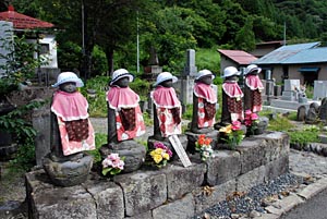 ![]() | ← 道端にたたずむ六体の石像。山深い里の ため、昔から冷害になやまされ、とくに凶作 の年には餓死者もでるほどでした。ゆえに、 働けぬ赤ん坊が「まびき」されるという 悲惨な行為もありました。この稚児像は 、その霊を弔い母の嘆きを慰めるために 建立されたものです→ | ![]() |