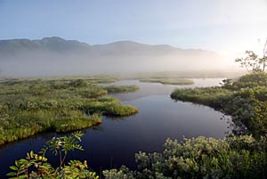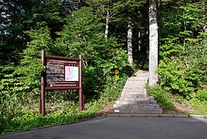 御池バスターミナル朝6:00発のシャトル バスに乗り込みまづ沼山峠に着く。 ←ここが沼山峠バスの終点で、いよいよ 尾瀬ヶ原への入り口である。 登山道入り口で、ここから道は全て木道で、 尾瀬ヶ原まで続く。→ | ![]() |