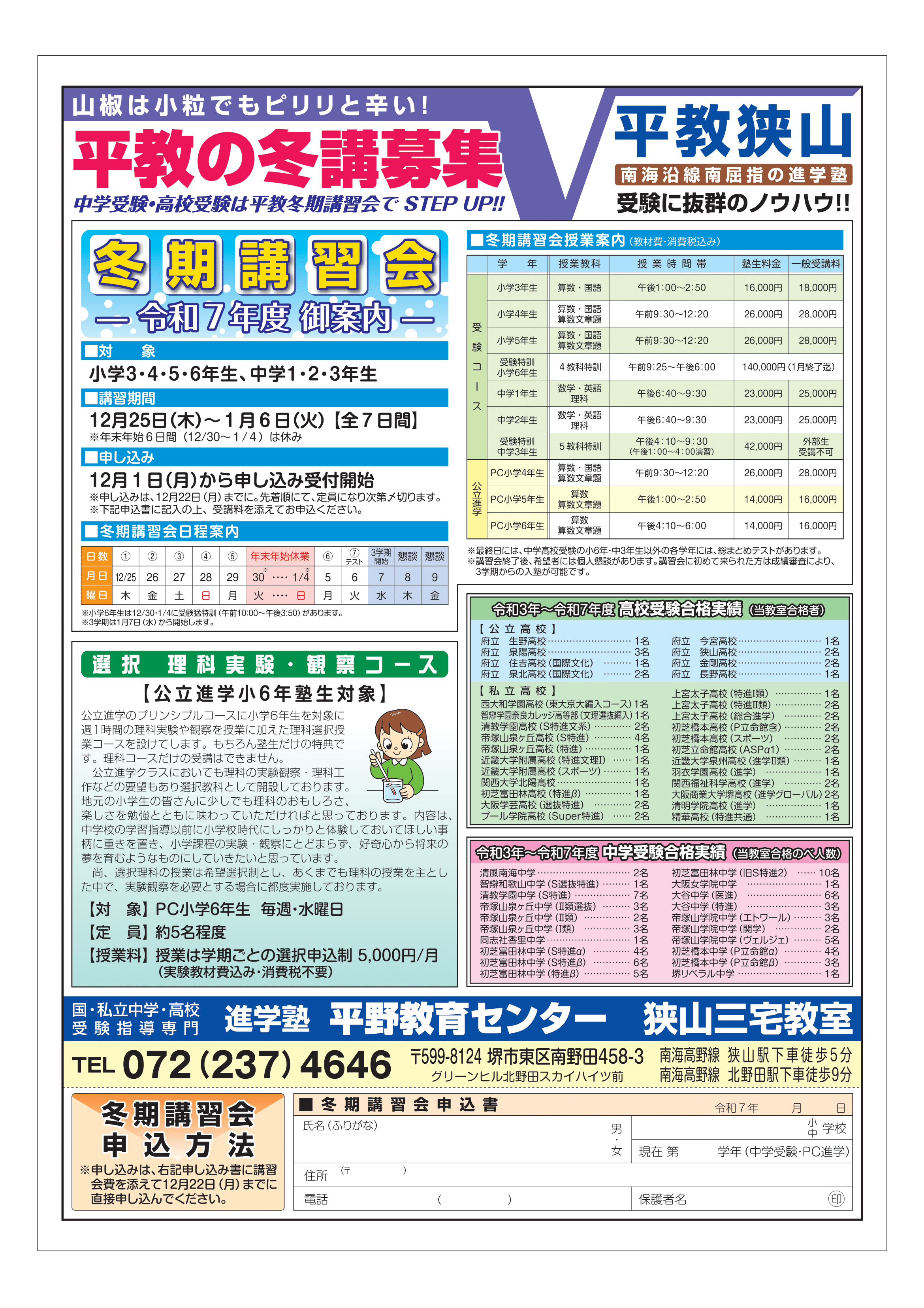 申し込み時はチラシの下部のキリトリ線で切り取り申込書を記入してお持ちください。 (チラシは塾にもございますので塾内にて記入してもらっても大丈夫です。) 詳細について不明な点などございましたら、お気軽に塾へお問い合わせください。