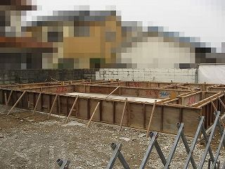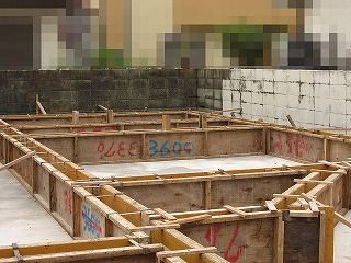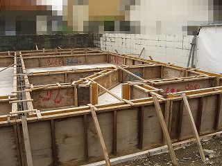 先週は雨の為、土間部分に雨が貯まって小さいプールと化していました。なので、殆ど進展がありませんでしたが、昨日作業を行って立ち上がり部分の木枠工事が終わってました。