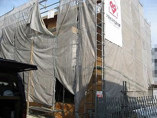 逆のアングルから撮ってみました。うっすらと写ってますが、屋根にも野地板が取り付けられて、一応風雨を凌ぐ事はできそうです。でも、まだサッシとかは入ってませんけどね・・・