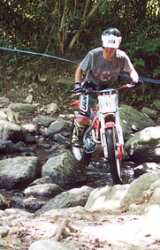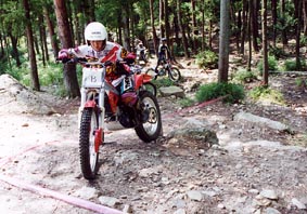 トライアル車を購入して一週間ちょっと。師匠から「大会出てみたら?」と誘われていたのは、まーくん(と大木くん)だったはず!大木くんは大会前日の練習も気合が入り、当日の朝もさわやかにお目覚めだった…がっ!まーくんは起きない。前日の仕事が深夜上がりだったため「今日は、やめとくよぉ〜」との寝ぼけた返事。仕方ないので彼をほっといて、会場に出発。 大会の採点方式はいくつかの班に分かれて、班内で交代で採点していくというもの。10のセクションは班ごとに好きな順に回って良い。…ということはあおいが終わらないと同じ班の人みんなに迷惑かけちゃうのねっ!うわぁ〜えらいこっちゃっ! はじめのセクシション下見。がびぃ〜ん!長いし、ガレガレだし、めちゃタイトターンだし、根っこあるし、なにこれ?って感じ。師匠に「足ついても良いから最後まで走ってごらん。」と言われたのだけど、足付くとか付かないとかあおいの場合そんなレベルじゃないわぁ〜。簡単なラインも教えてもらいつつスタートしたのだけど…、入って1mで両足付き。この目の前の岩をどうやってよけるのん?1LAPは半分も進まないうちに断念。もう一度スタート地点に戻ろうとしても、今度はエンジンがかからない。あせればあせるほどエンジンかからない!ここですでにじわりと泣き入ってました。同じセクションにもう一度チャレンジしようとしたき、まーくんがカメラ持って応援に登場。2LAP目はばたばた足を突きつつ進み、あともう少しのところ最後の根っこでバイクだけ発射してしまいOUT50cm手前で終了…。あぁ〜情けなや。もう駄目よぉ〜。 「まーくん代わってっ!」と、師匠と主催の方の了解を得て、ここから交代してもらった。皆様ご迷惑をおかけしてずびばぜんでじだぁ〜。ほっぺたパンパンして、ここからは皆さんのお手伝いだぁ〜。 トライアルのルールや採点の仕方を教わり(知らんかったんかいっ!)、カメラマン兼筆記係をさせてもらった。ファインダーを覗きつつ『師匠、なんて綺麗なんだぁ〜。』と感激写真はこちら。ここをこう行くと言ったラインで確実に入ってきてくれるので、とても写真が撮りやすい! 表彰式でもひとつびっくり!見ていてうまいなぁ〜とは思っていたけれど、大木くんなんとビギナークラスで優勝だぁっ!おめでとう!まーくんはあおいの残した5点×2も響いてあんまり良い結果じゃなかった。トライアルってなんて実力の差がはっきりするんでしょう? 大会終了後も練習に余念の無いまじめな大木くんでした。その体力分けちくり〜! |