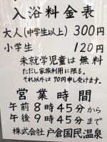 | 戸倉国民温泉の所在は長野県千曲市戸倉芝宮2228−2 国民温泉というユニークな名称は「広く大衆の皆様にお役に立つ施設を造りたい」という先代社長のネーミングによるものだそうです。 その言葉通り、低価格で高品質の温泉は自家源泉。湧き出す温泉は無色透明の単純温泉。飲泉も可能で、シャワーやカランにも温泉を使用しています。 湯舎から90mほど離れたところに源泉湧出地があり、毎分250リットルの湧出量。源泉温度が38.5℃と低いため加温はしていますが、源泉100%かけ流し。飲泉も可能で湯口にはコップが置かれています。 ペットボトルに湯を詰めて持ち帰る常連客も多いそうです。全体的に派手さはありませんが不思議と癒される温泉銭湯です。 |