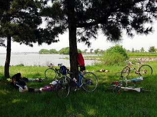 守山市に入ったくらいにいい感じの松の木陰がある芝生があったので最後の休憩を取る。みんな横になって